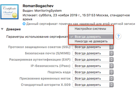 Переходим в связку ключей и в свойствах установленного сертификата меняем уровень доверия на “Всегда доверять”.