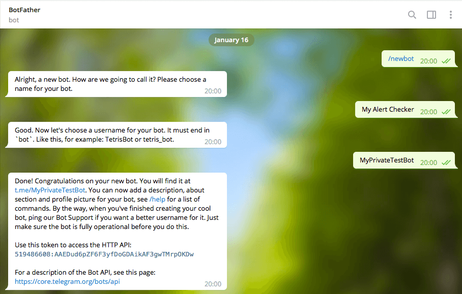 Шаг 1. Создание бота в Telgram Добавляем бота под названием BotFather и отправляем ему команду /newbot, выбираем имя, которое будет отображаться в списке контактов и адрес. Например, «My Alert Checker» с адресом «MyPrivateBot» .