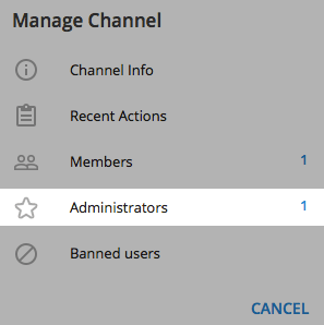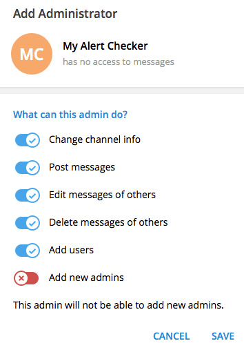 Необходимо добавить в список администраторов созданного нами бота — именно он будет публиковать уведомления в канал.